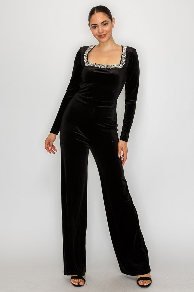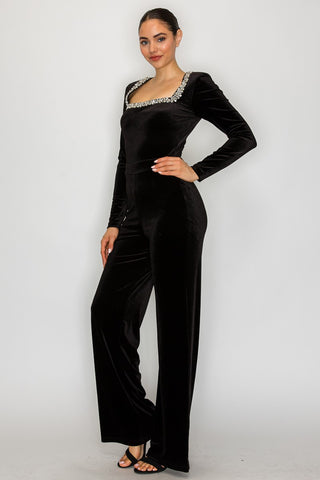 - Soft, velvety jumpsuit featuring a rhinestone embellished square neckline