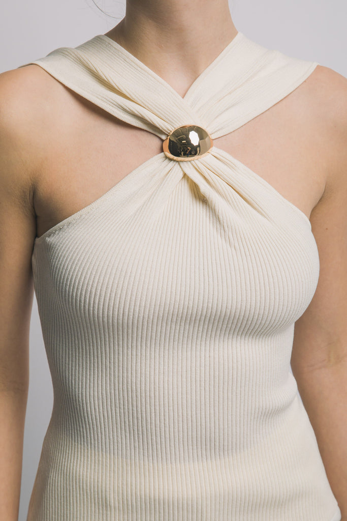 - This top features a sleek ribbed knit silhouette designed to sculpt and flatter, with a striking crossover neckline secured by a polished gold statement accent. The asymmetrical halter design creates a refined, modern edge while keeping the look timeless and versatile.