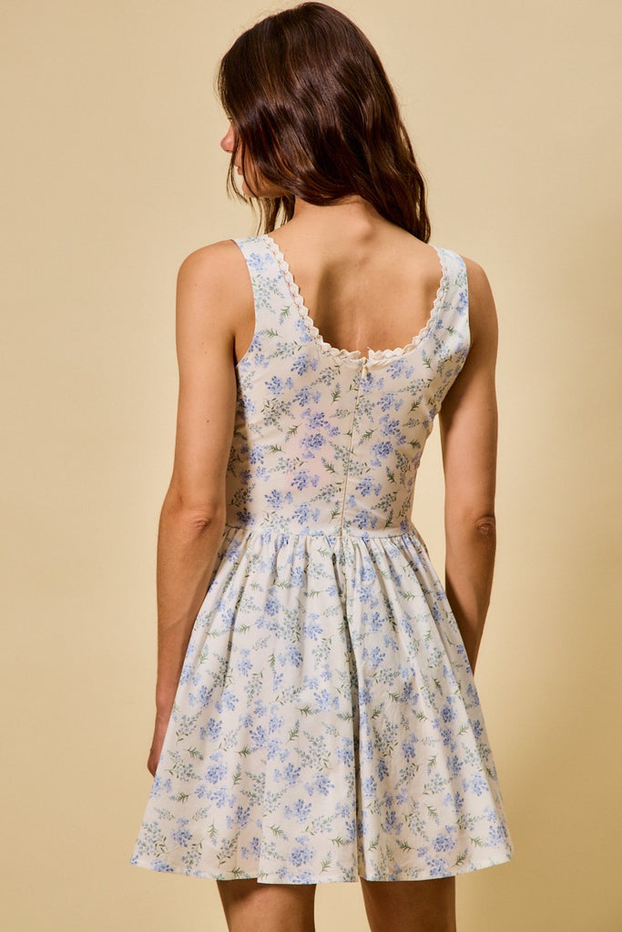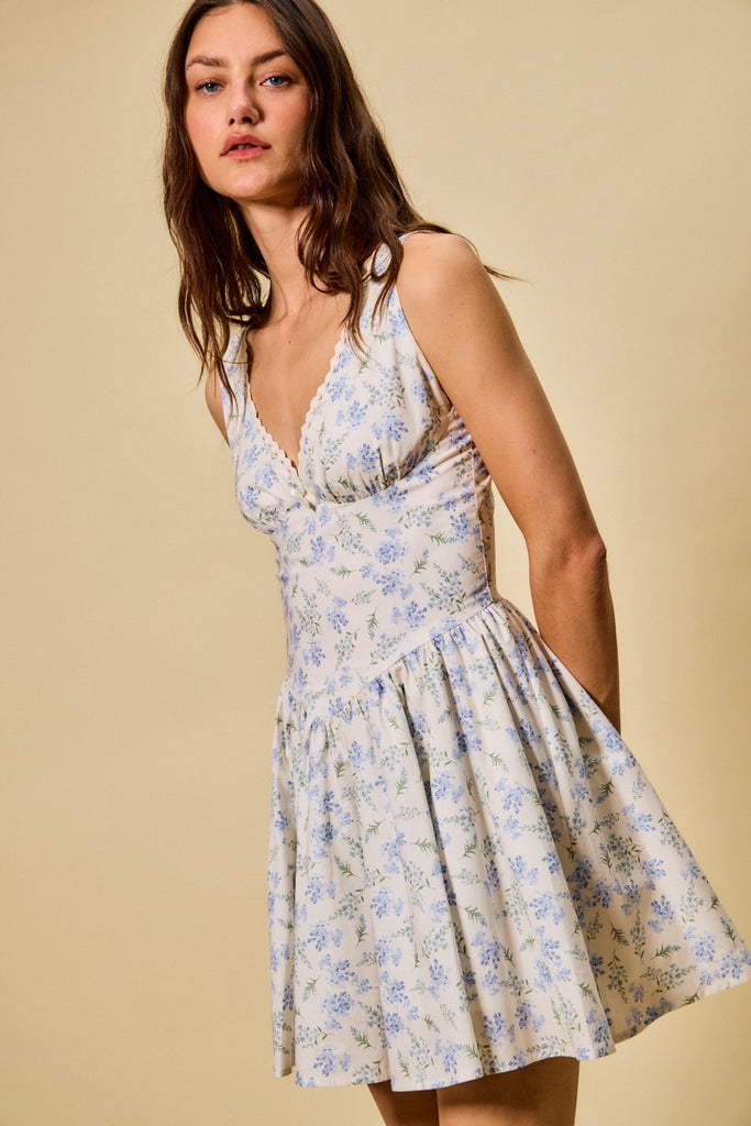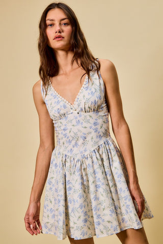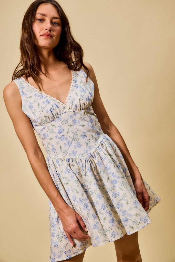 This charming mini dress features a delicate floral print and a flattering V-neckline trimmed with lace. The sleeveless design and lightweight fabric make it perfect for warm weather. The fitted bodice accentuates the waist, while the flared skirt adds a playful touch. Ideal for casual outings or summer events, this dress combines comfort and style effortlessly.
