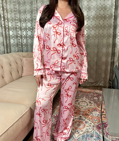 BOW PRINTED SILKY PAJAMA SET - PINK