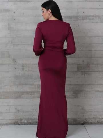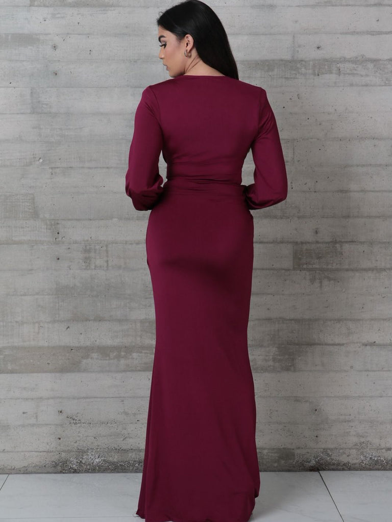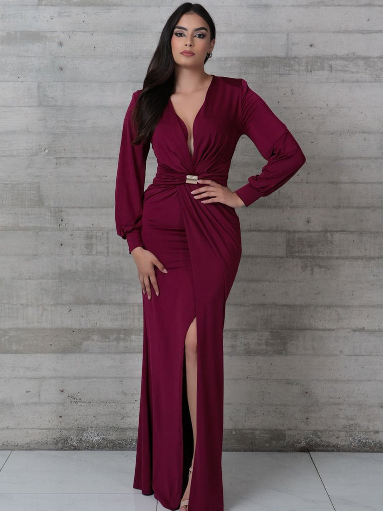 - Deep-plum long-sleeve ruched maxi dress accented with elegant gold hardware at the waist, designed to create a beautifully flattering silhouette.