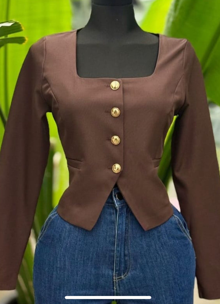 - Brown structured long sleeve top featuring gold button hardware and a split hem